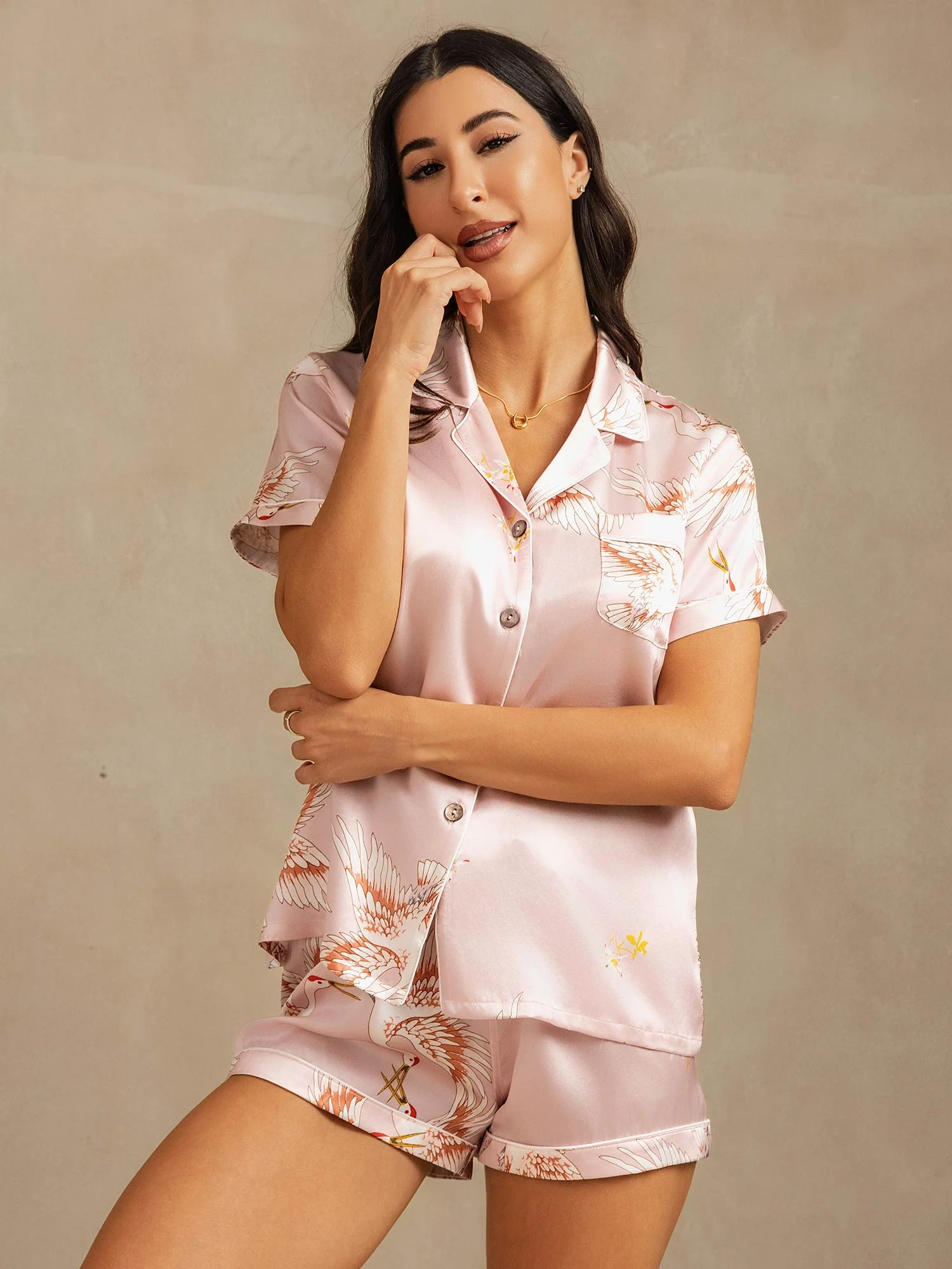 Details: Gemaakt van luxueuze zijde, bestaat deze tweedelige pyjama-set uit een los zittend shirt met korte mouwen en klassieke notch-kraag, en bijpassende shorts met comfortabele elastische tailleband. Het sierlijke kraanvogelmotief geeft een serene en verfijnde uitstraling—perfect om in stijl te ontspannen.